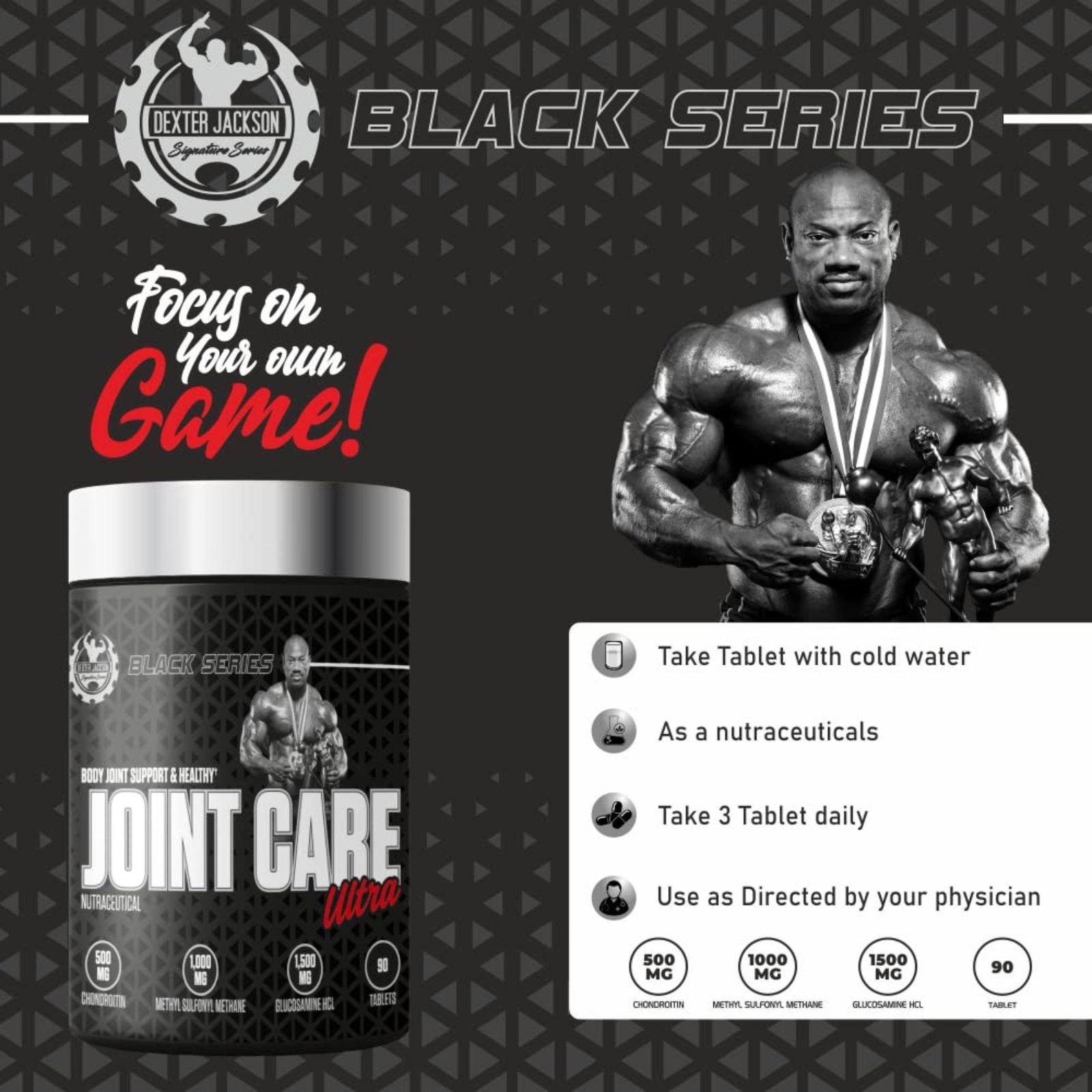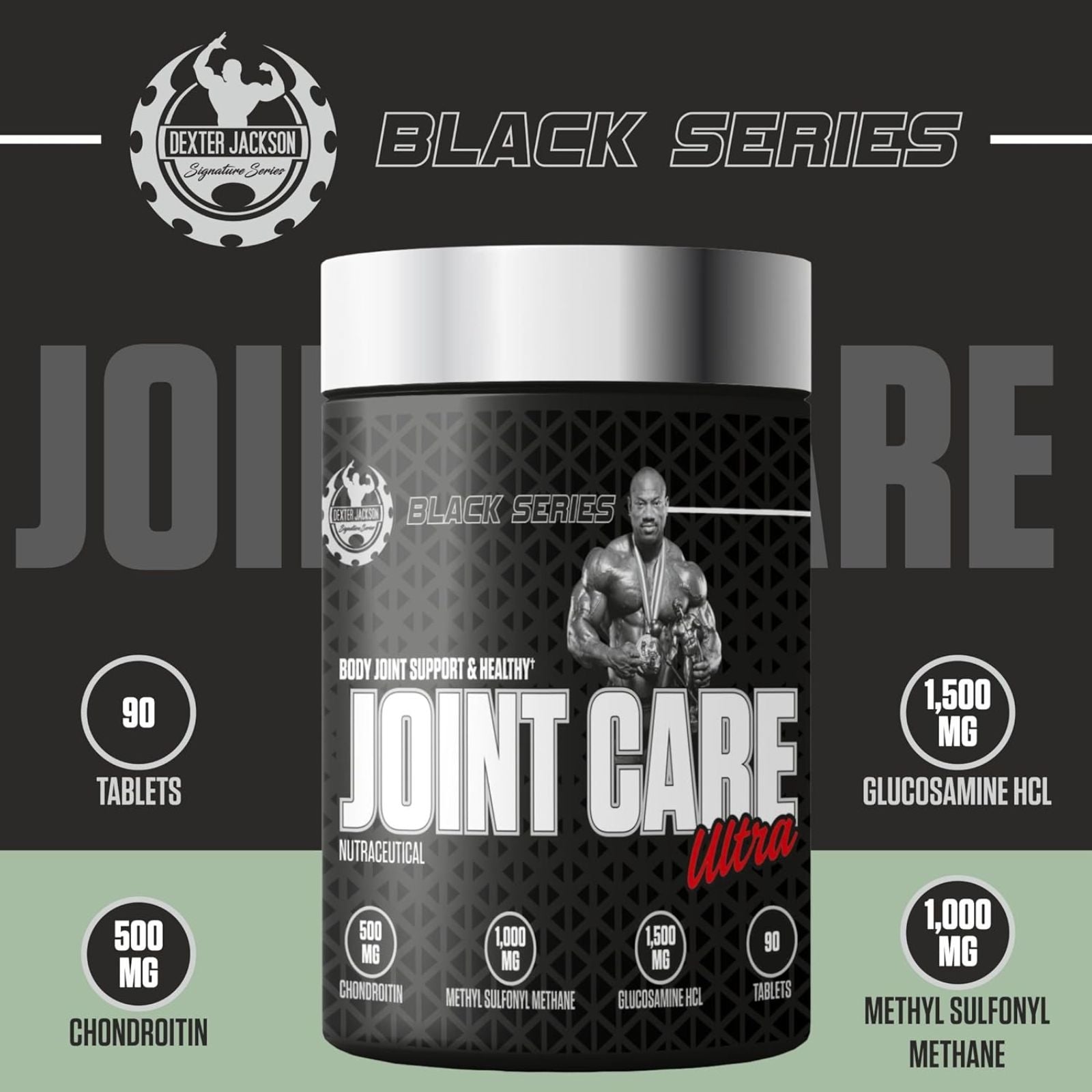 Improve your joint health and mobility with Dexter Jackson's Black Series Joint Support tablets. With a powerful blend of natural ingredients, including glucosamine, chondroitin, and MSM, these tablets provide benefits such as reducing inflammation, promoting cartilage repair, and easing joint pain. Keep your joints healthy and strong with Dexter Jackson's Black Series Joint Support.