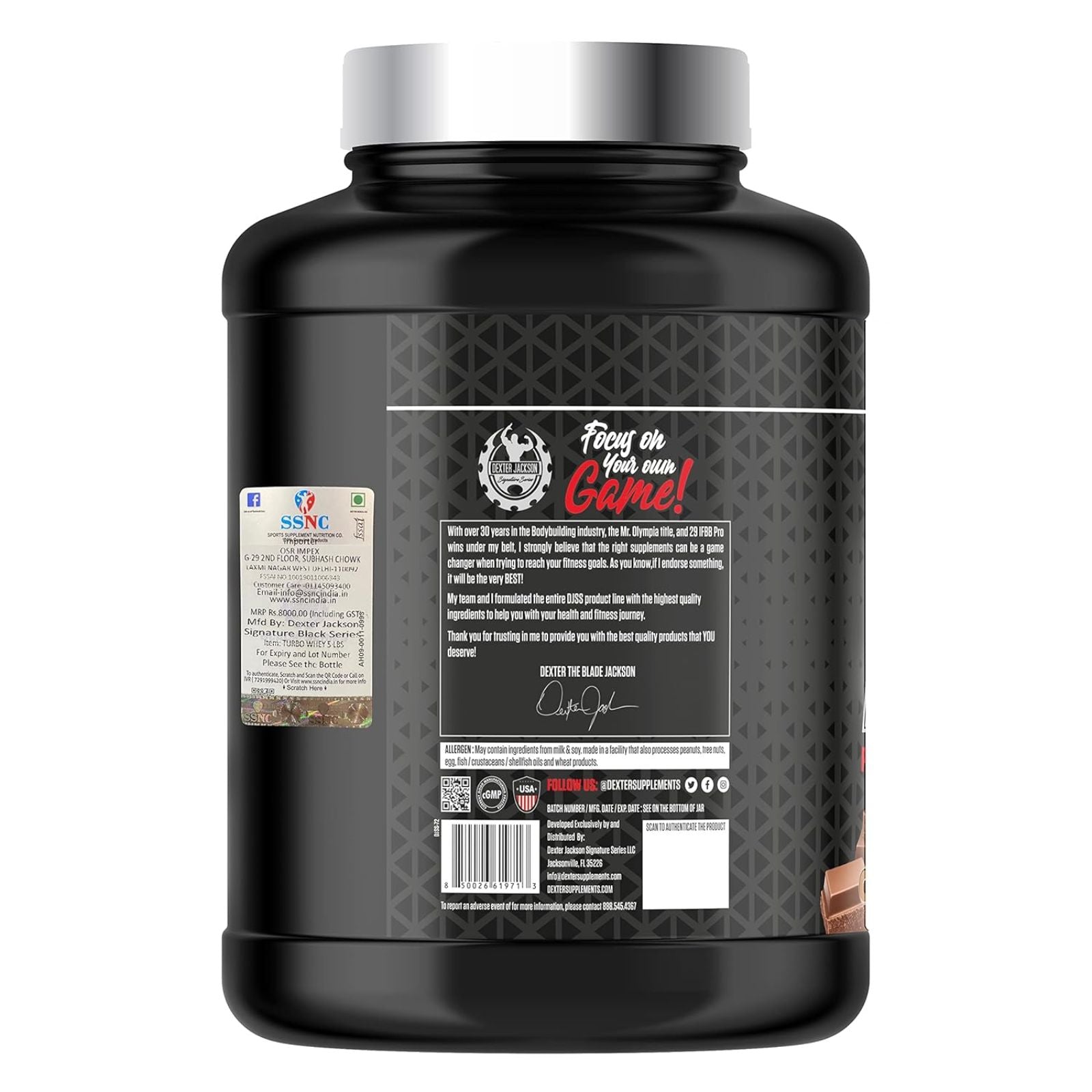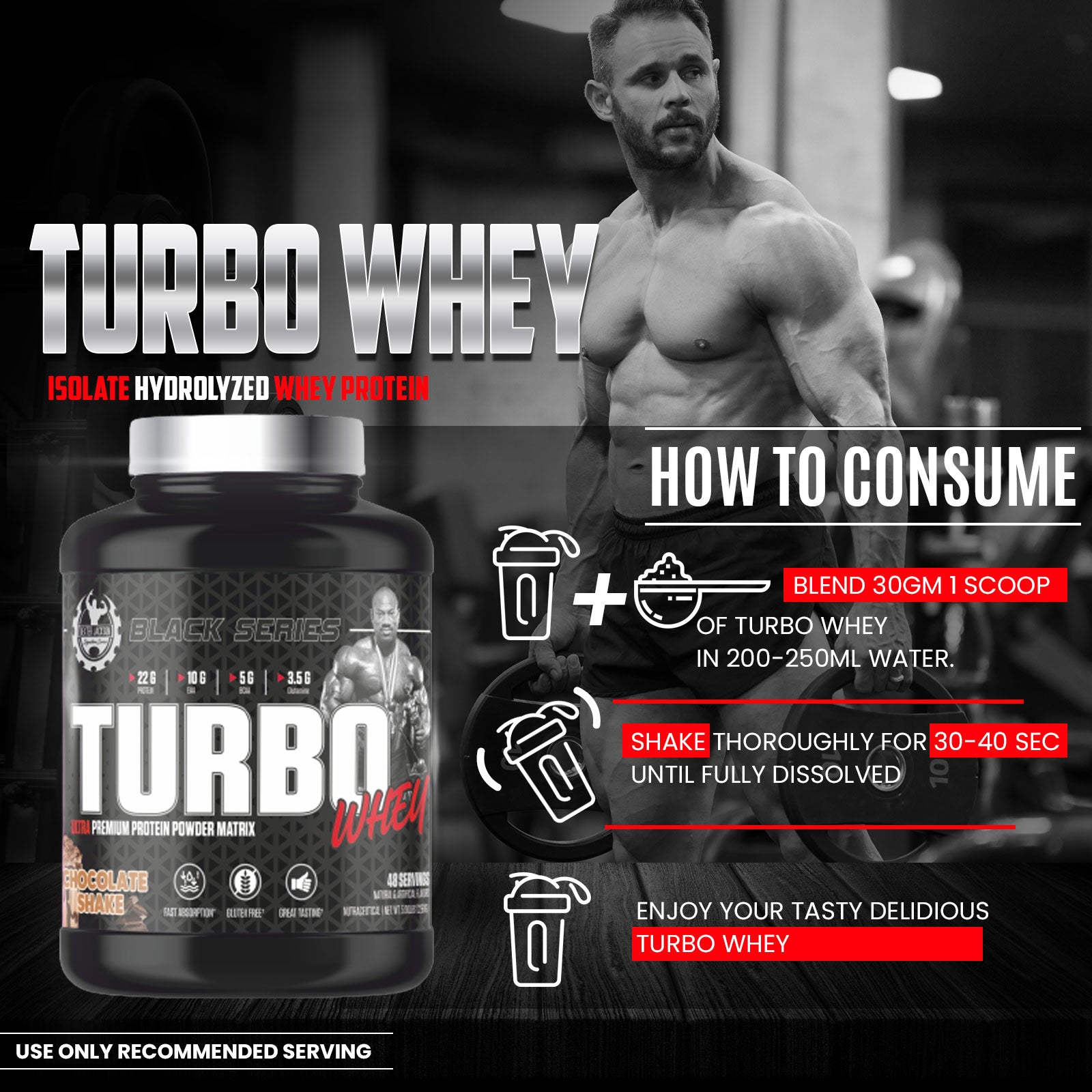 Introducing Dexter Jacson Black Series Turbo Whey, a high-quality protein supplement that comes in a 5lb tub with 48 servings of delicious chocolate shake flavor. Specially designed to support muscle growth and recovery, our Turbo Whey provides a convenient and tasty way to meet your daily protein needs. Say hello to your new workout companion!