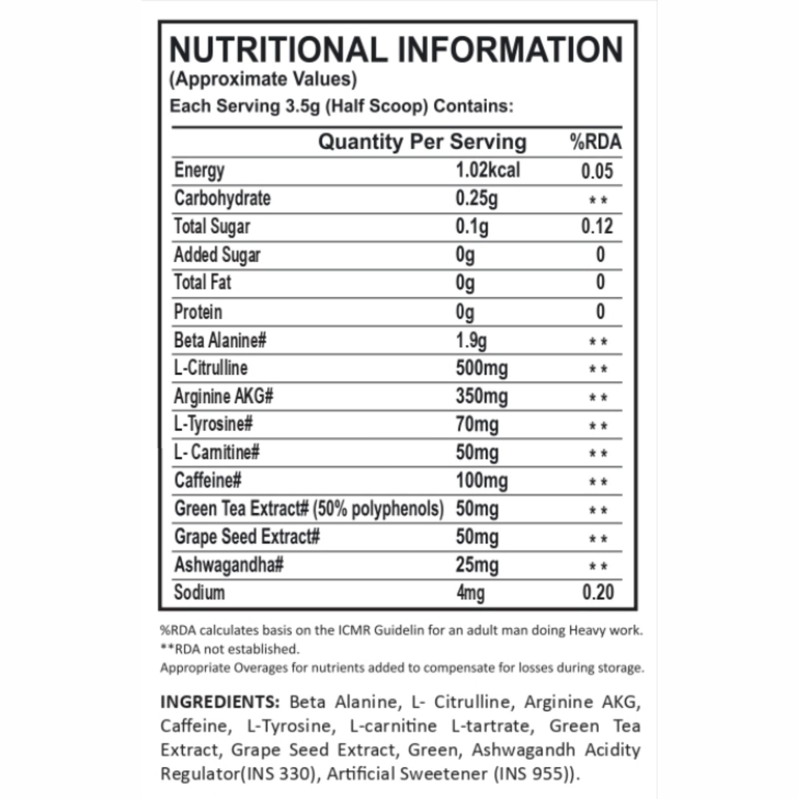 INGREDIENTS: Beta Alanine, L- Citrulline, L-Arginine HCL, Caffeine Anhydrous, Taurine, Betaine Anhydrous, Green Tea Extract, Grape Seed Extract, Ashwagandha, Acidity Regulator (INS 330), Artificial Sweetener (INS 955).