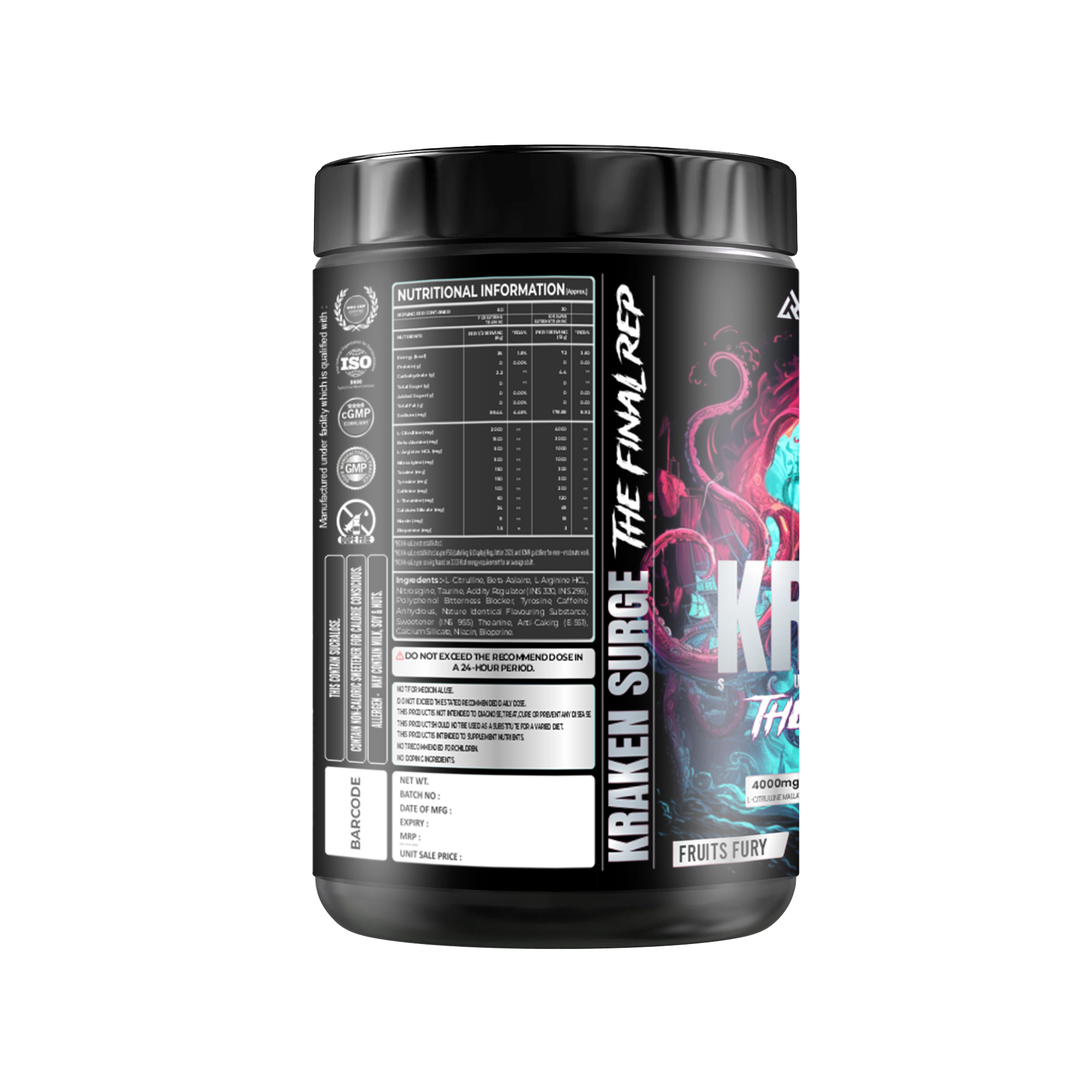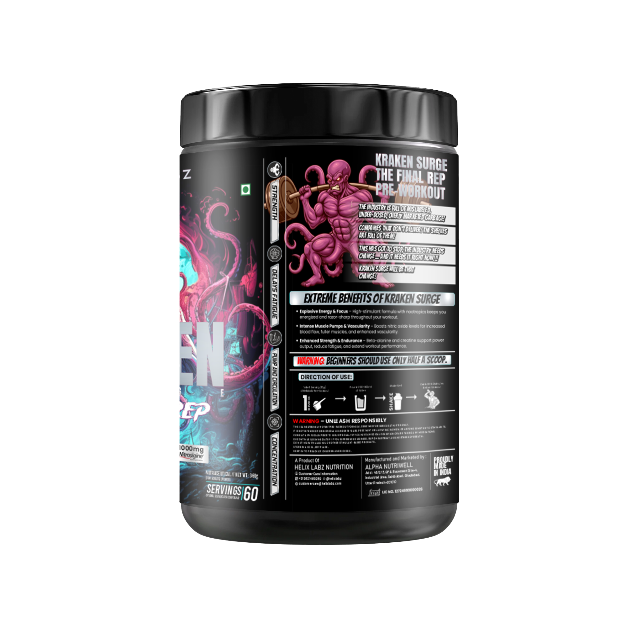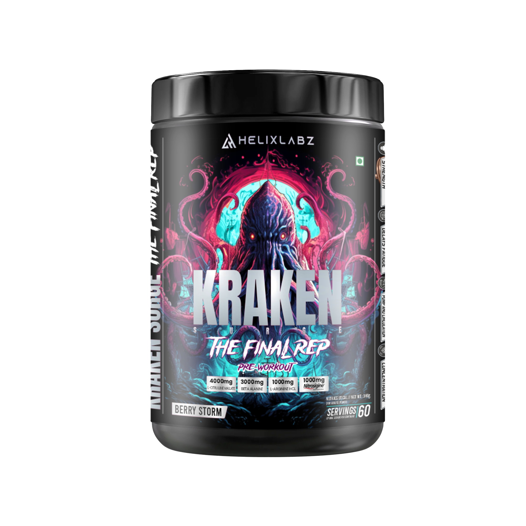 Unleash your full potential with Helix Labz Kraken Pre Workout Powder, engineered to elevate your training sessions. Each container delivers 60 servings of a potent formula designed to boost energy, enhance focus, and support endurance during intense workouts. Whether you're pushing through resistance training or high-intensity cardio, Kraken provides the sustained performance edge you need. Mix one serving with water 20-30 minutes before exercise for optimal results. Transform your fitness journey with a pre-workout that's built for serious athletes and fitness enthusiasts committed to achieving their goals.
