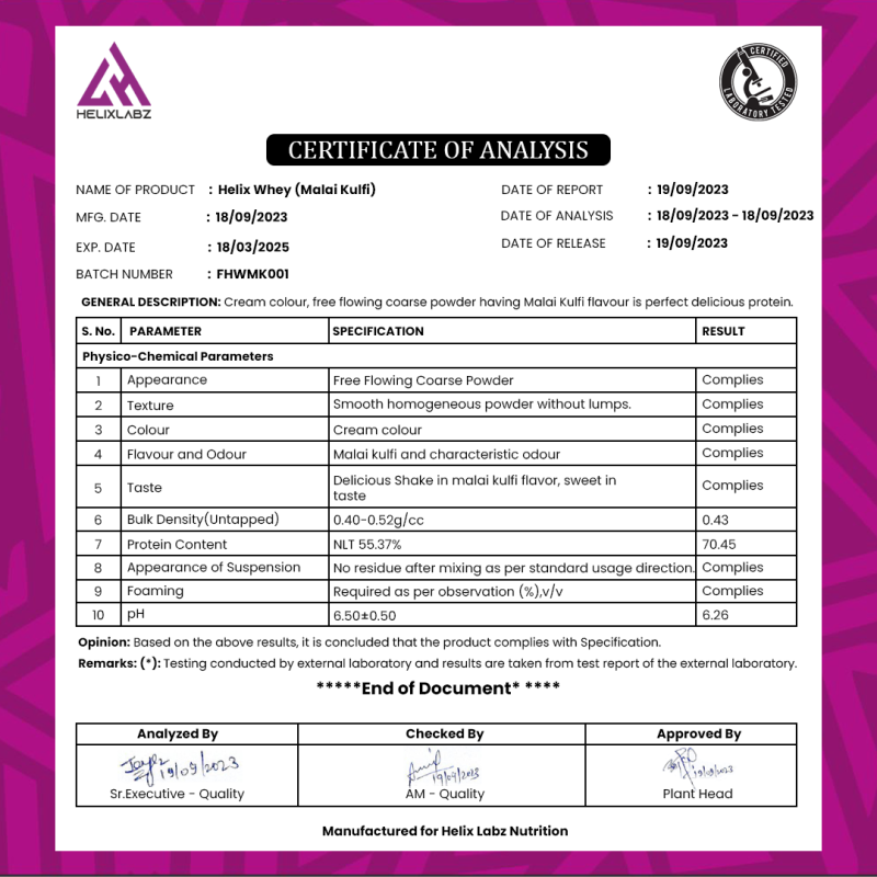 Helix 100% WHEY Protein Matrix – Malai Kulfi | 2kg (4.4LBS) | High Protein