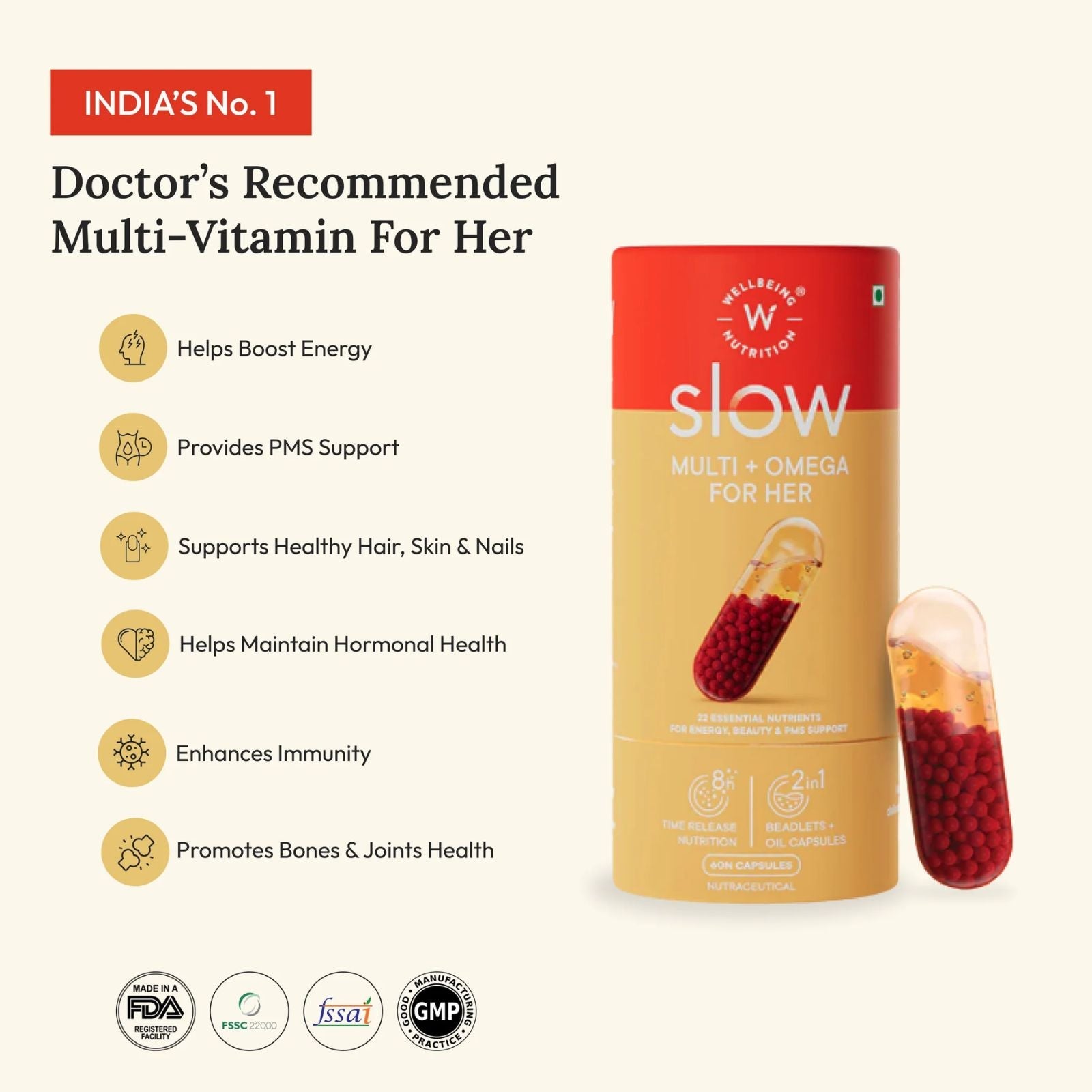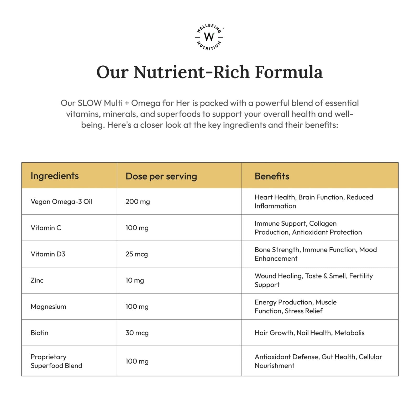 Enhance your vitality with Wellbeing Nutrition's Slow Multi + Omega for Her. With 22 vital nutrients, vegan omega-3s, antioxidants, and superfoods, boost your energy, immunity, and hormonal balance with just one capsule. Stay healthy with science-based nutrition and plant-based ingredients.